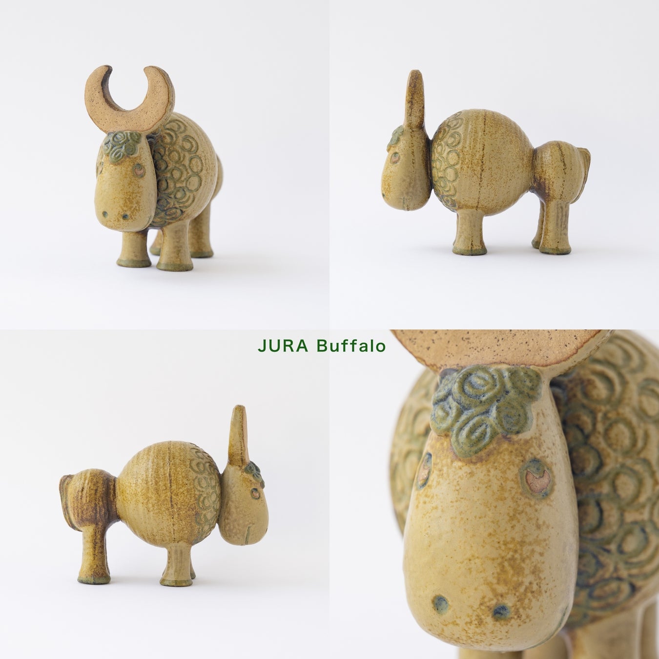 「JURA」シリーズは、6体の動物で構成されています。こちらはその中のひとつ「バッファロー」の陶器です。シャモット炻器製ならではの風合いが楽しめ、クリッとした上目遣いや丸みのあるフォルムが魅力的です。