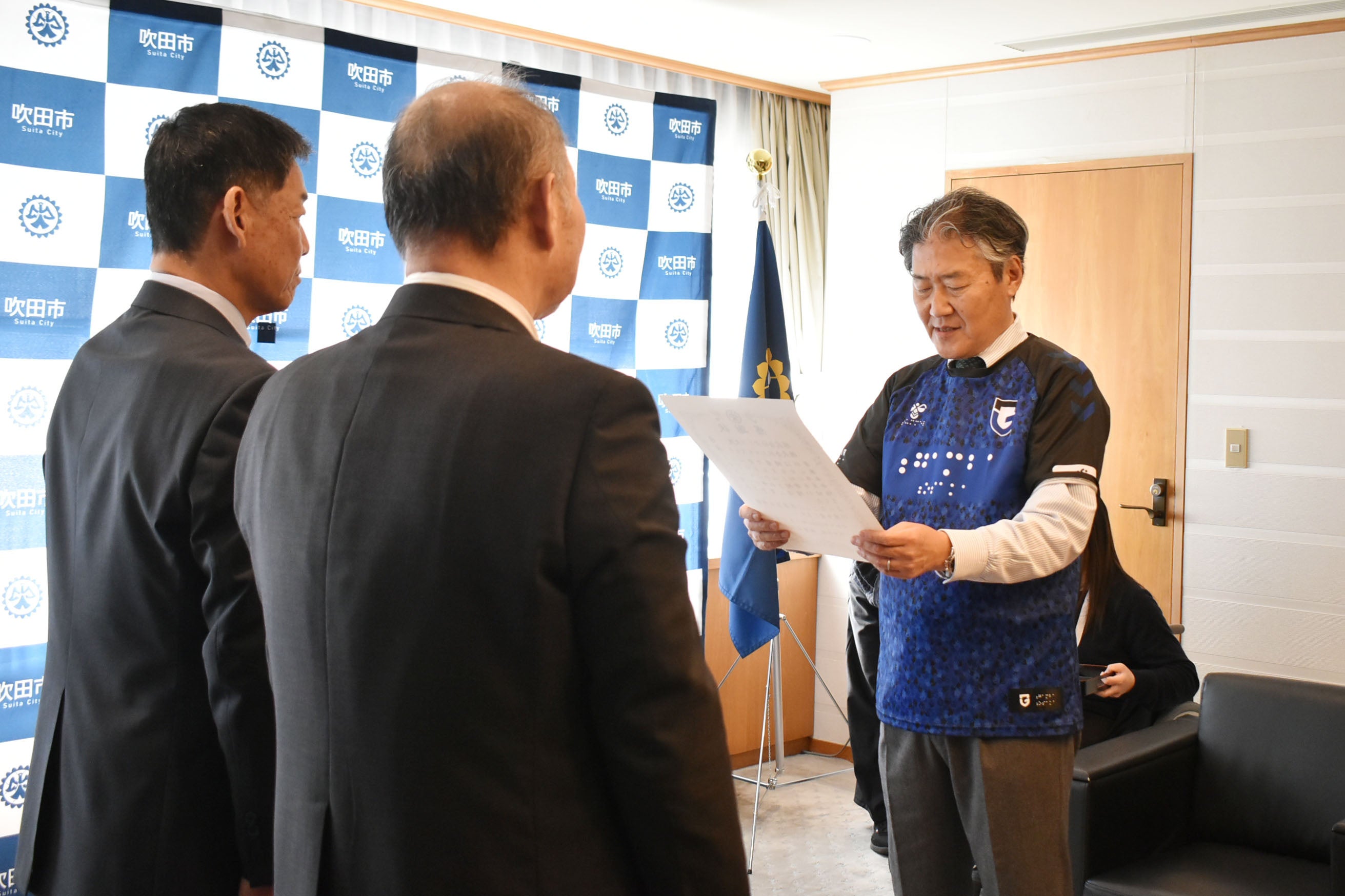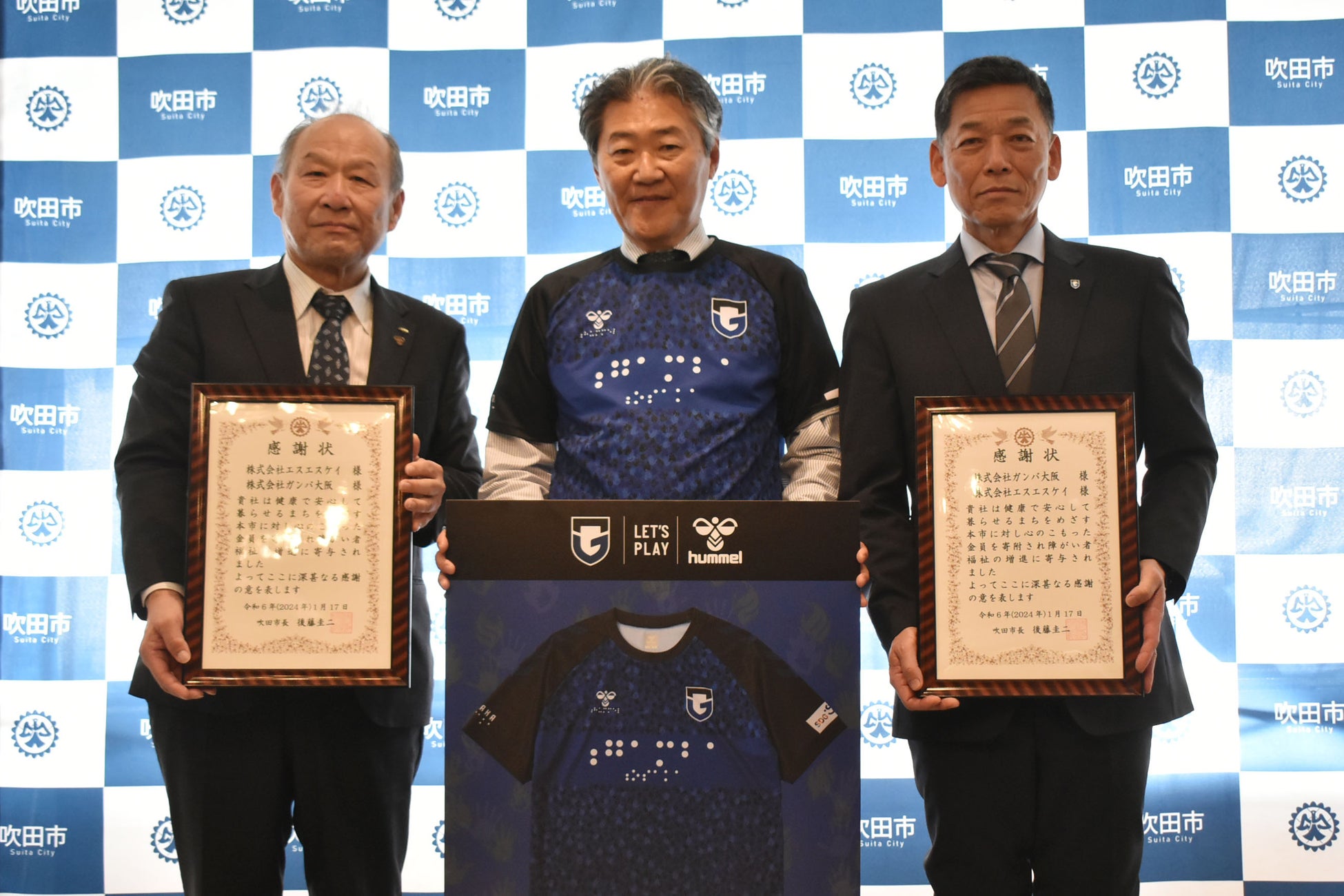 ヒュンメルを展開する株式会社エスエスケイ常務取締役の安井浩二は、ガンバ大阪の小野忠史社長と共に、後藤市長から、「本市の障がい者福祉の増進に寄与され、感謝の意を表します」と感謝状を受け取り、「視覚障がい者の方たちが暮らしやすくなるなど、多様性が受け入れられる社会づくりに、微力ながら私たちも貢献できればと思っています。今回はありがとうございました」と話しました。