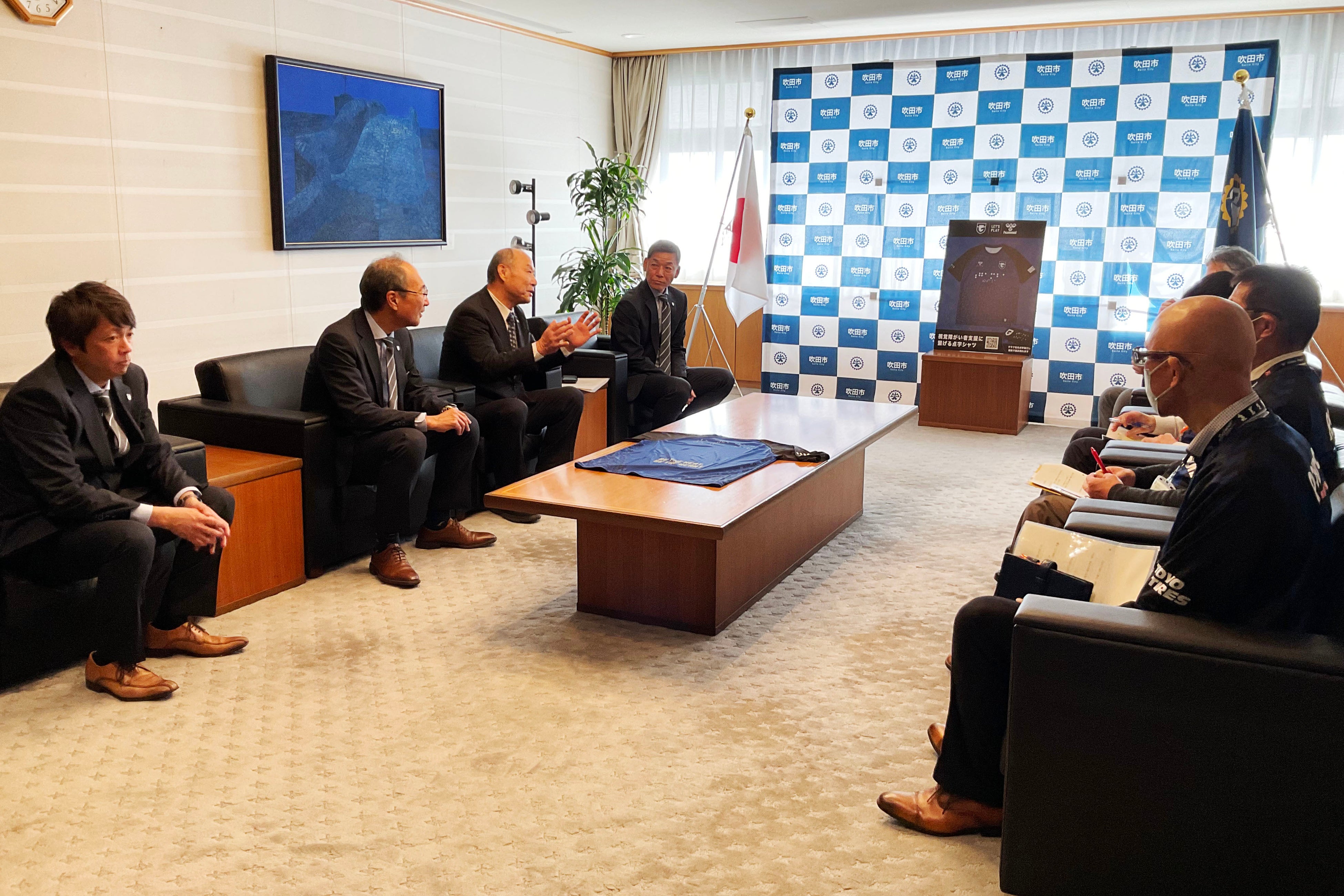 今回の寄付は、このシャツの一般販売と選手着用分のオークションの収益の一部を合わせたもので41万円になりました。市役所で行われた贈呈式では、後藤圭二市長が、「デザインがいいですね。点字はデザイン性にも優れているので、ネクタイでも良さそう」と話しながら着用。「着心地もいいですね」と撮影に応じてくれました。
