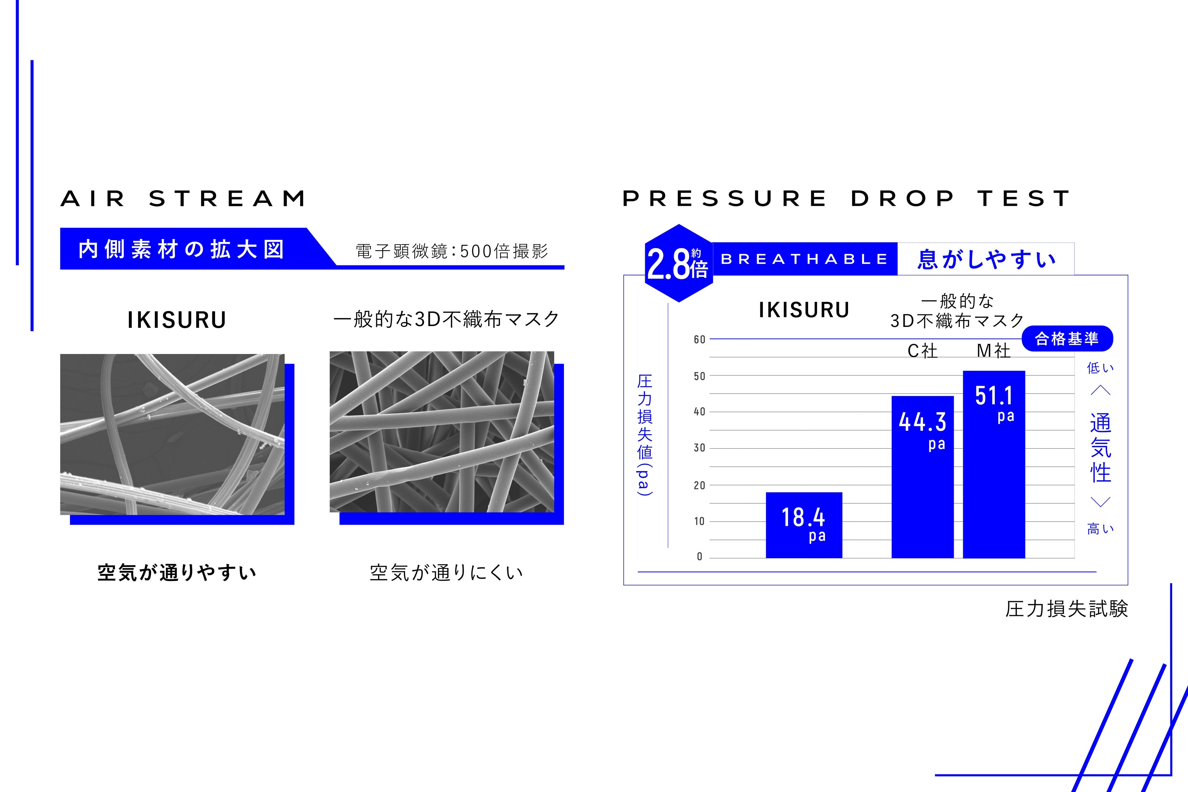 圧力損失試験では、一般的な3D不織布マスクより、約2.8倍息がしやすいという数値結果を取得しています。