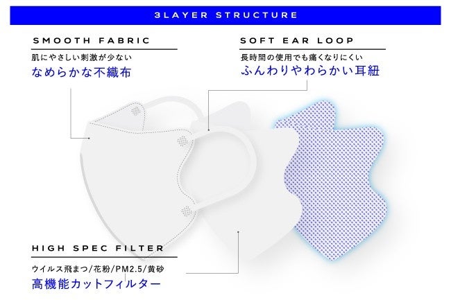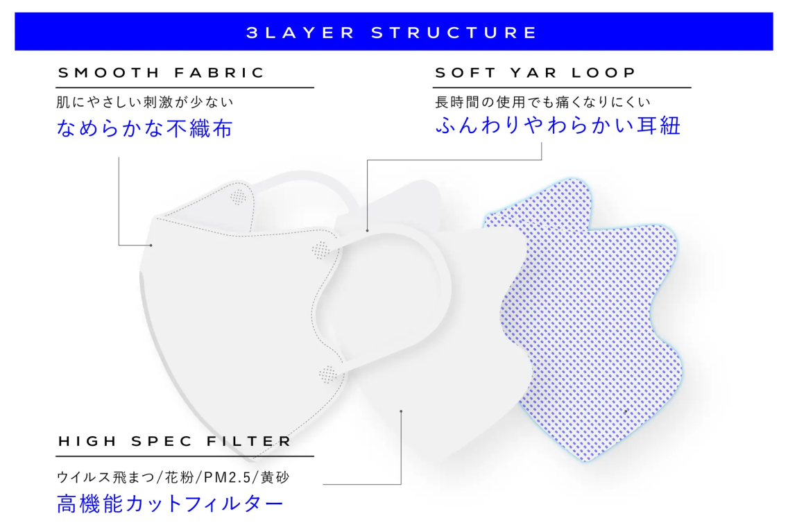 吸水性・速乾性・放熱性など、従来のマスクでは、解消できなかった機能のすべてを兼ね備え、涼しさと通気性を極限にまで高めた、まったく新しい不織布マスクです。