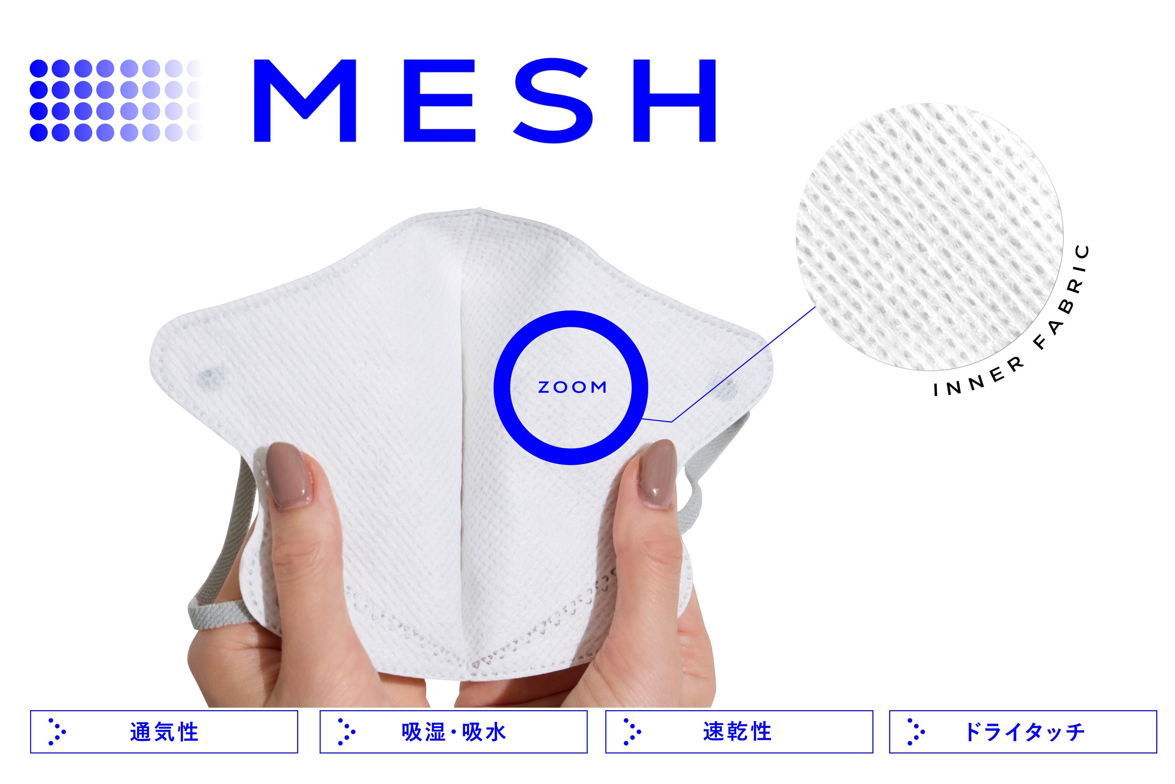 マスクの内側に、超通気性のメッシュ構造の不織布を使用。