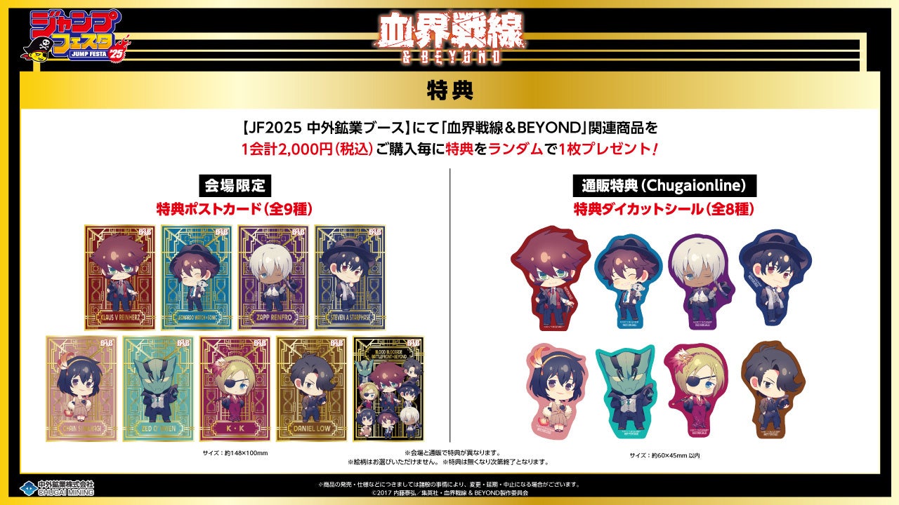 中外鉱業ブースにて『血界戦線 & BEYOND』JF2025関連商品を1会計2,000円(税込)ご購入毎に、特典ポストカード(全9種)をランダムで1枚プレゼントします。