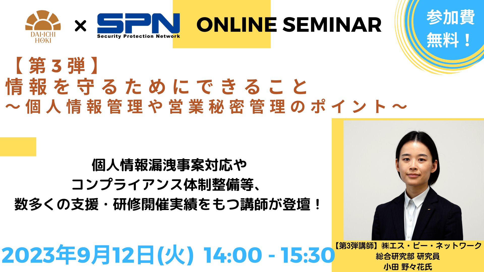 最終回である第3弾では株式会社エス・ピー・ネットワーク 総合研究部 研究員である小田 野々花氏にご登壇いただき、個人情報の管理や営業秘密などの「情報」の管理や取り扱いについてご講演いただきます。