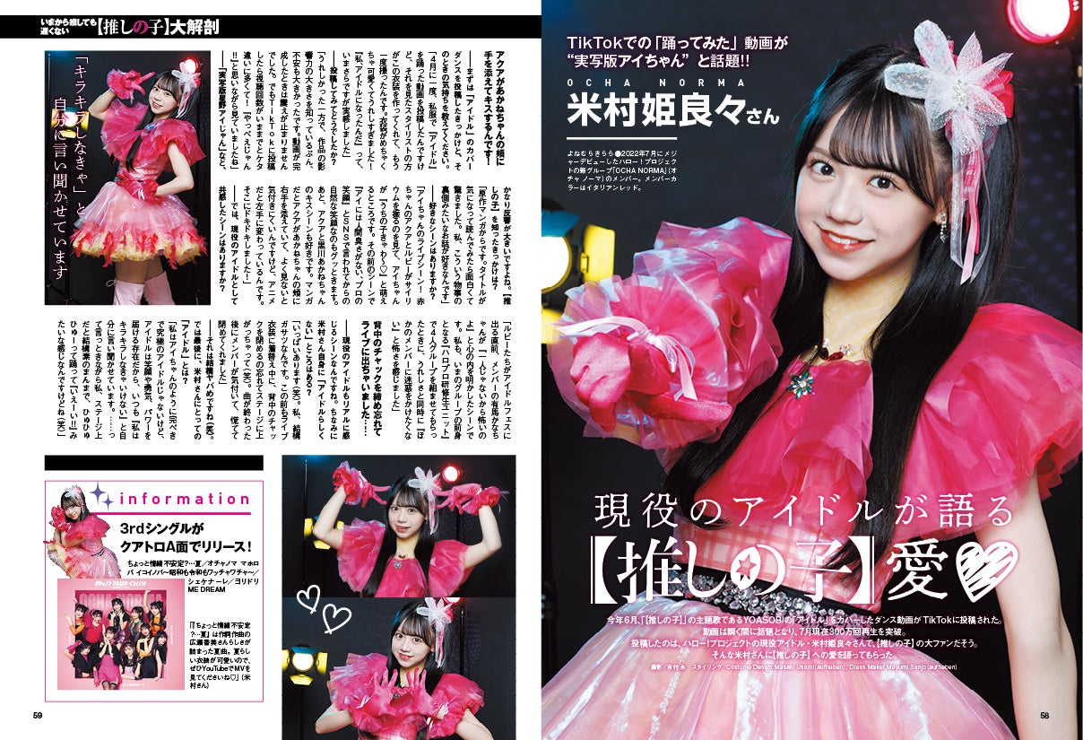 なお、主題歌であるYOASOBIの「アイドル」をカバーしたダンス動画が“実写版アイちゃん”だとして話題のハロプロアイドル、米村姫良々さん(OCHA NORMA)の撮りおろしインタビューも収録。再現性抜群のコスチュームを身にまとい、作品愛をキュートにアツく語ってくれました。