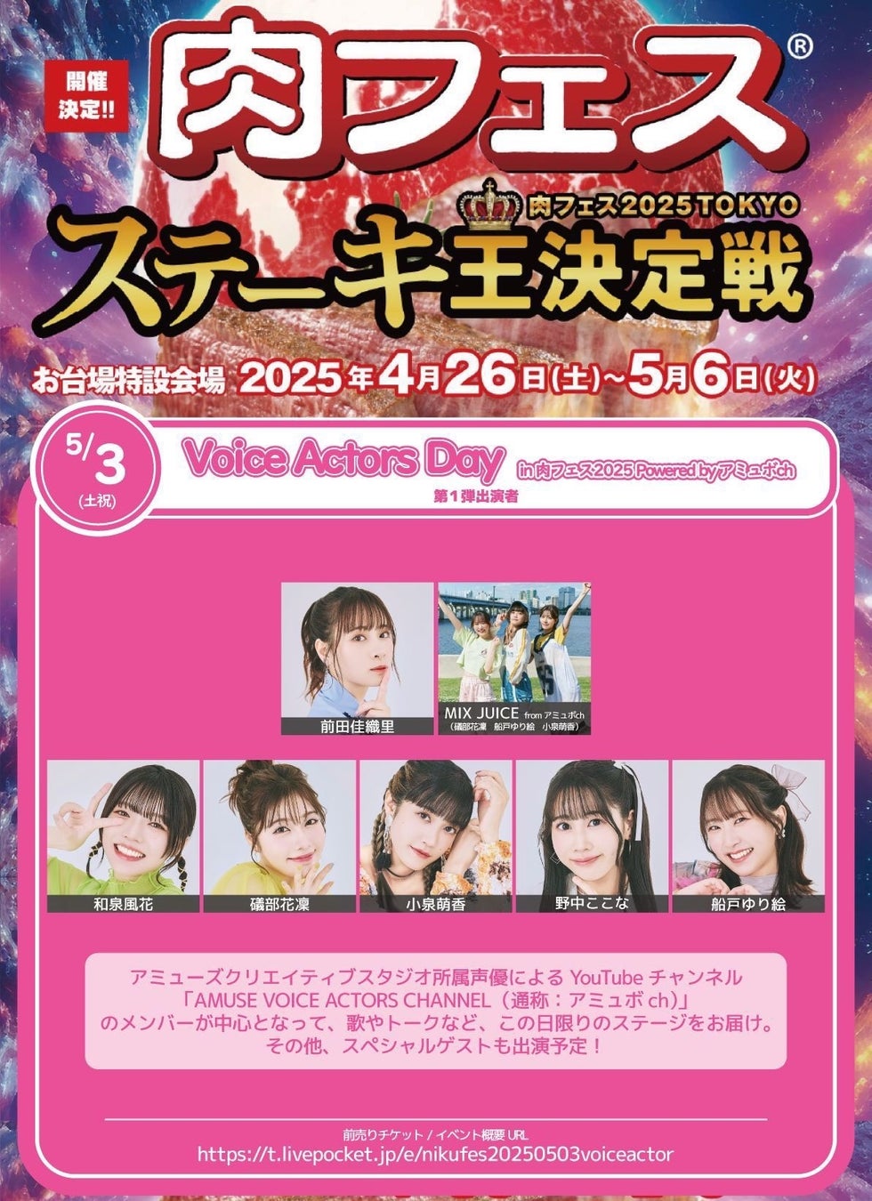 前田佳織里 MIX JUICE from アミュボch 和泉風花 礒部花凜 …etc「肉フェス2025 TOKYO ステーキ王決定戦」5月3日(祝)開催!Voice Actors Day 出演者を公開