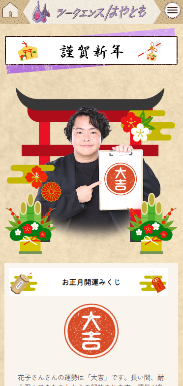 ※「お正月開運みくじ」をご利用いただくには、公式サイト『シークエンスはやともの占い』(https://hayatomo.net)への会員登録が必要です。(月額330円)