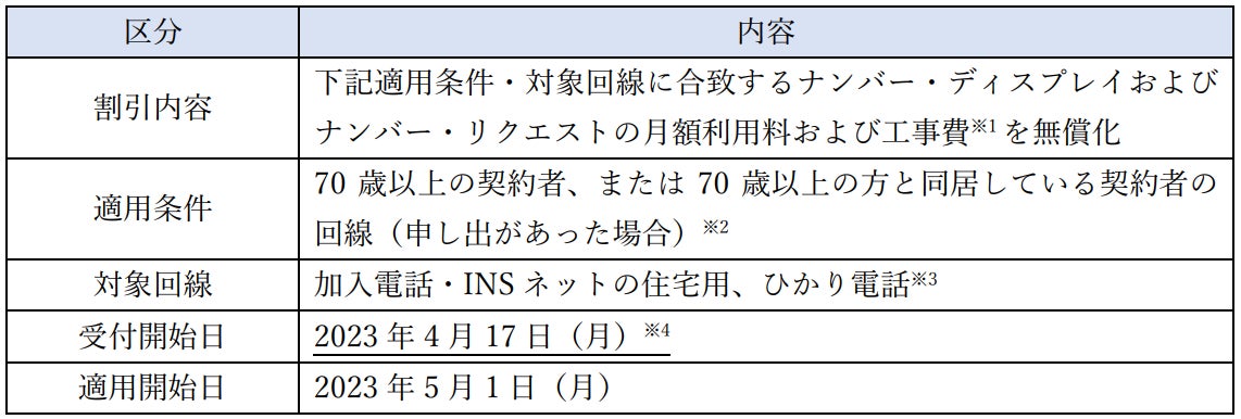 70歳以上の契約者または70歳以上の方と同居している契約者の回線を対象として、ナンバー・ディスプレイおよびナンバー・リクエストの月額利用料および工事費を無料とします。