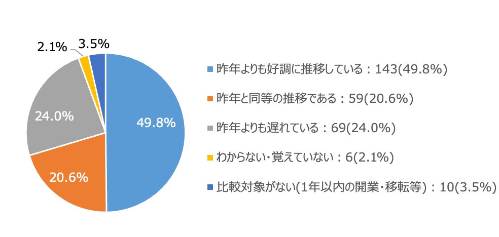 次に、忘年会・新年会の予約状況について、昨年との比較をしてもらったところ、「昨年よりも好調に推移している」(49.8%)、「昨年と同等の推移である」(20.6%)と70.4%が昨年の予約状況と同等またはそれ以上であるという結果になりました。