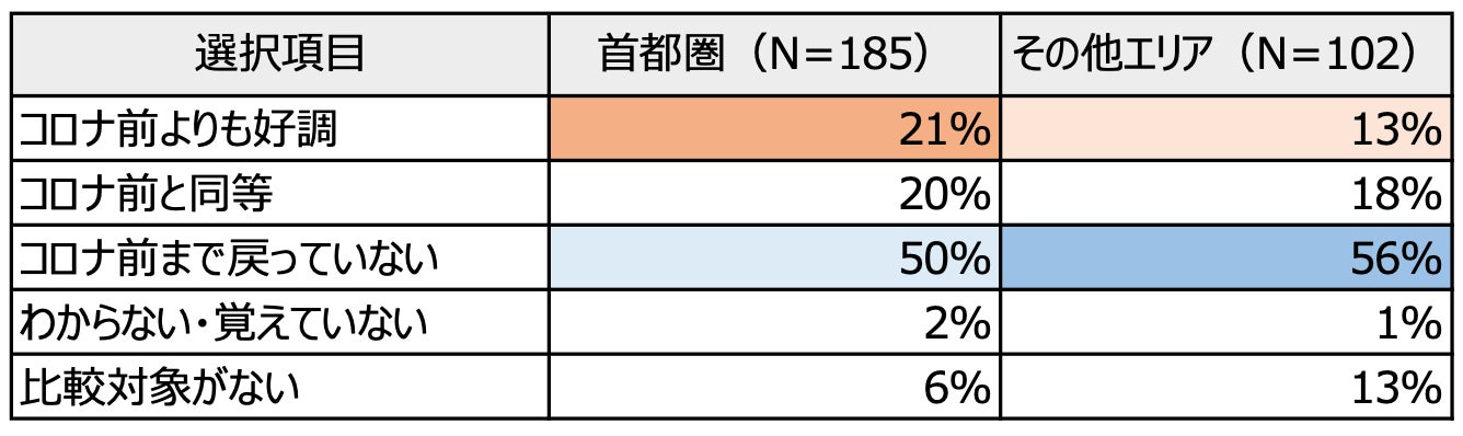 また、店舗のエリア別に分類してみると、コロナ前と比較して、「好調」の割合が、首都圏(21%)に対してその他エリア(13%)、一方、「コロナ前まで戻っていない」の割合が、反対にその他エリア(56%)に対して首都圏(50%)という結果になりました。首都圏が先行して予約状況が回復してきていることがわかります。