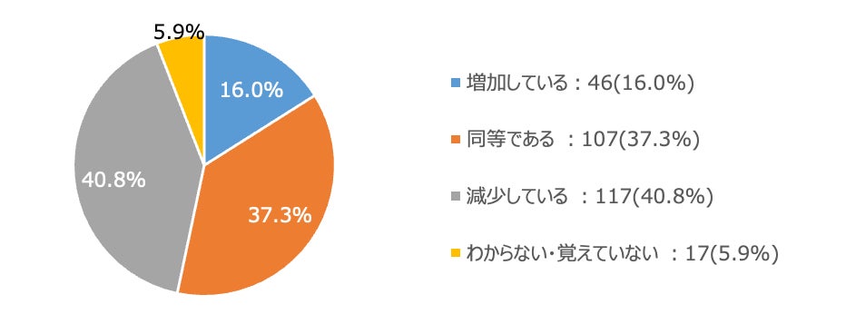 続いて、グループ予約の人数に変化があるか聞いたところ、「増加している」(16.0%)、「同等である」(37.3%)という回答がある一方、40.8%が「減少している」と感じていることがわかりました。