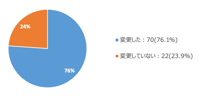 予約単価の変化に関連して、「年末年始用に特別メニューを設けている」と回答した飲食店(N=92)に、コロナ前から価格や内容を変更したか聞いてみたところ、76.1%が「変更した」と回答しました。