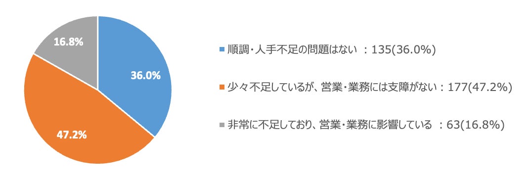 最後に、繁忙期である年末年始の人材確保の状況について聞いたところ、「順調・人手不足の問題はない」(36.0%)に対し、「少々不足しているが、営業・業務に支障がない」(47.2%)、「非常に不足しており、営業・業務に影響している」(16.8%)という結果になりました。