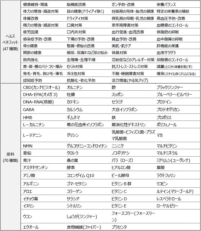 ヘルスベネフィット別に顕在市場規模をみると、「健康維持・増進」がトップ。以下「美肌・肌ケア」、「目の健康(ドライアイ対策を除く)」、「関節の健康」、「疲労回復」、「栄養バランス」の順位となった。対前年の動きをみると、「認知症予防」が25.6%、「脳機能の改善(認知症予防を除く)」が15.0%、「目の健康(ドライアイ対策を除く)」が14.5%増加した。一方、減少幅が大きいのは「生理痛・生理不順対策」で17.0%、「口臭対策」が15.4%減少した。 ※インテージヘルスケア規定のヘルスベネフィット47種類中
