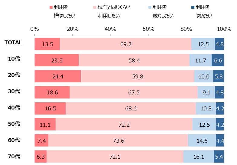 現在の健食サプリ利用者に、今後、健食サプリをどの程度利用したいか聴取した。全体では「利用を増やしたい」が13.5%、「現在と同じくらい利用したい」が69.2%、「利用を減らしたい」は12.5%、「利用をやめたい」は4.8%という結果となった。年代別にみると、10代から30代の若い層では、他の世代と比較して、「利用を増やしたい」が20%前後と高い。一方、40代以降は年代が上がるにつれて「利用を減らしたい」が高くなり、70代で16.1%と最も高い。(図1)