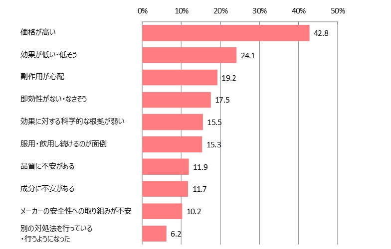今後、健食サプリの利用を減らしたい、やめたい理由としては、「価格が高い(42.8%))」が最も多く挙げられ、次いで、「効果が低い・低そう(24.1%)」「副作用が心配(19.2%)」となった。また、品質・成分・メーカーの安全性への取り組みに対する不安も理由として挙げられている。物価の上昇が続く中、価格の要因が、継続意向に大きな影響を与えていると考えられる。(図2)