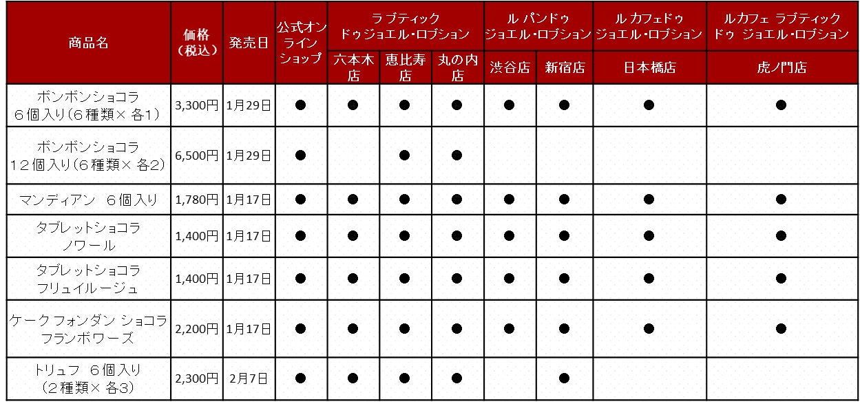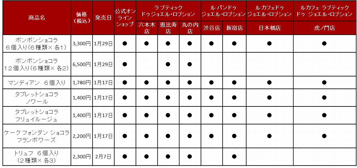 今年のバレンタインは、人気のボンボンショコラをはじめ、マンディアン、タブレットショコラ、パウンドケーキ、トリュフショコラなど見た目も華やかな6種類の商品と、100セット限定販売の「ル ツール ド フランス ショコラ ~ショコラでフランス地方巡り~」の計7種類を販売いたします。