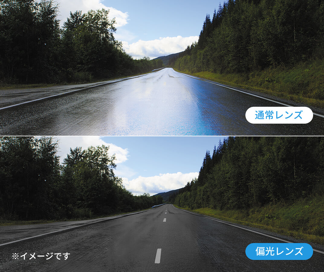路面や水面、ガラスなどの反射光をカットして、ギラつきを抑える高機能カラーレンズです。反射光をカットしてスッキリした視界を実現しています。偏光機能でドライブ、釣り、ゴルフなど様々なアクティブシーンを快適にします。