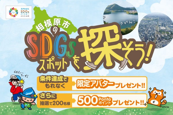 LMは本イベントに合わせ、Green Ponta Actionに特定のスポットを訪れるとスコアや特典を獲得できる「チェックイン機能」を追加しました。期間中、相模原市内に設けた約160カ所のSDGsスポットに足を運び、アプリでチェックインいただくと、10スコア(1カ所当たり)や限定アバターを受け取ることができます。SDGsスポットは、相模原市とともに、SDGsの達成に向けた取り組みや地域課題の解決、SDGsの普及啓発に取り組んでいる企業・団体などの「さがみはらSDGsパートナー」に関連した場所や相模原市のSDGsに関連する公共施設です。アプリ内では、さがみはらSDGsパートナーの取り組みをご紹介します。また、特典として、スポット1カ所にチェックインで、もれなく相模原市SDGsキャラクター「えすでぃーちーずくん」アバターをプレゼントします。さらに合計10カ所にチェックインすると、もれなく相模原市マスコットキャラクター「さがみん」アバター、抽選で200名様に500Pontaポイントをプレゼントいたします。