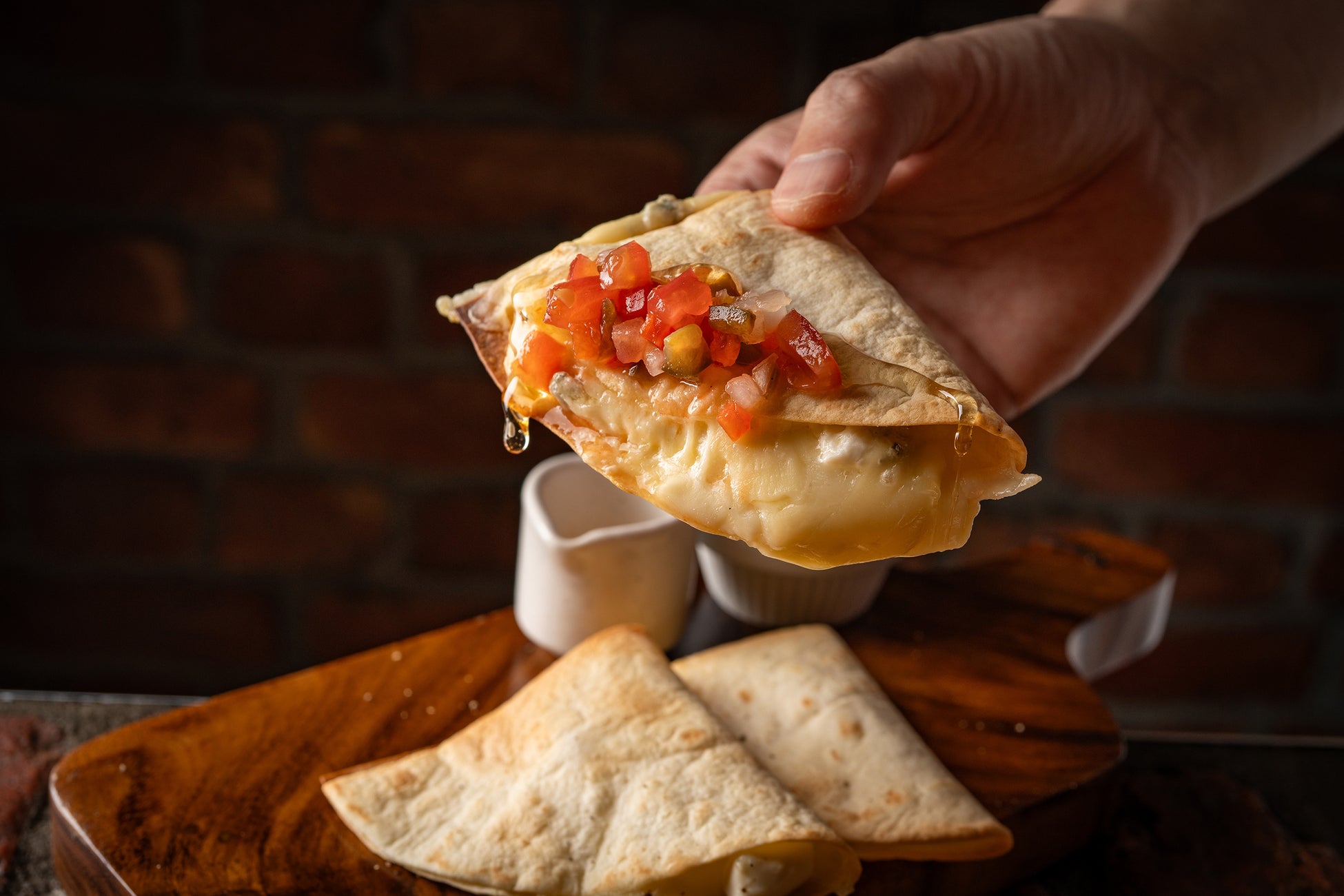十勝品質事業協同組合のラクレットチーズ、小林牧場のクリームチーズなど4種のチーズとチリコンカンを十勝・新得町産そば粉のトルティーヤで包んだ特製ケサディーヤ。