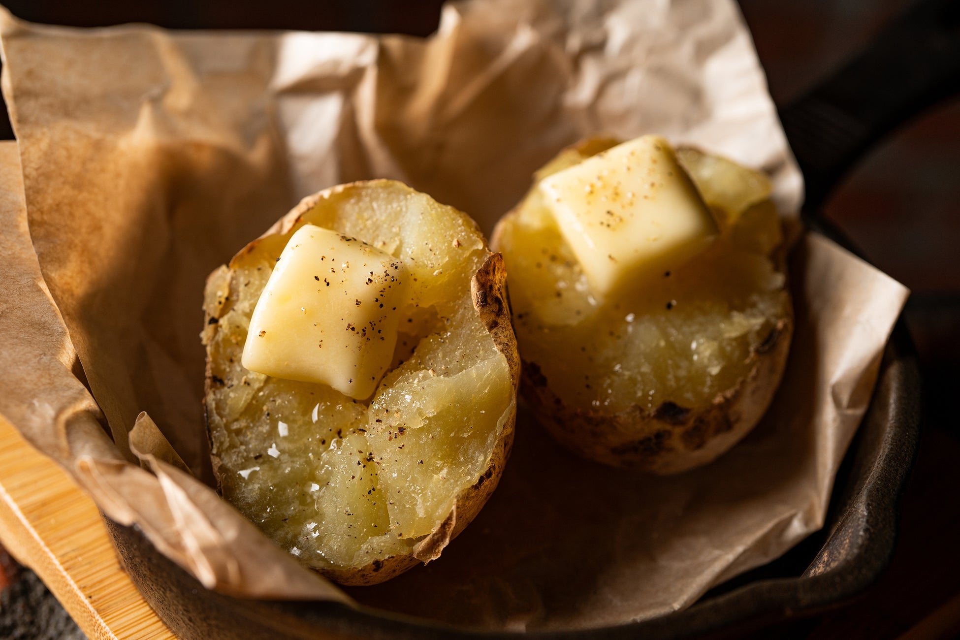 雪室で2年間寝かせた北あかりはじゃがいもの糖化がすすみ、しっとりとした食感と甘味が特長です。アツアツのじゃがいもにジャージー牛の発酵バターを添えて贅沢に仕上げました。