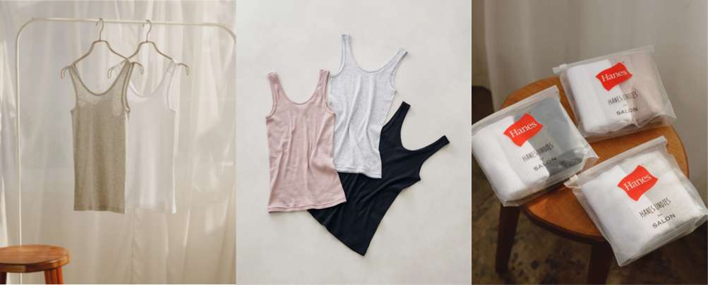 Hanesとの別注アイテムとなる“Hanes for SALON オーガニックコットンリブタンク2Pセット”は、女性の体型にあわせたSALON独自のパターンを採用。タンクトップの安心感とキャミソールの華奢見えを叶える、絶妙なネック&バックラインがカジュアルながらも女性らしい印象を演出。ストレスフリーな着心地を楽しめる、脇に縫い目のない丸胴編みで仕上げました。
