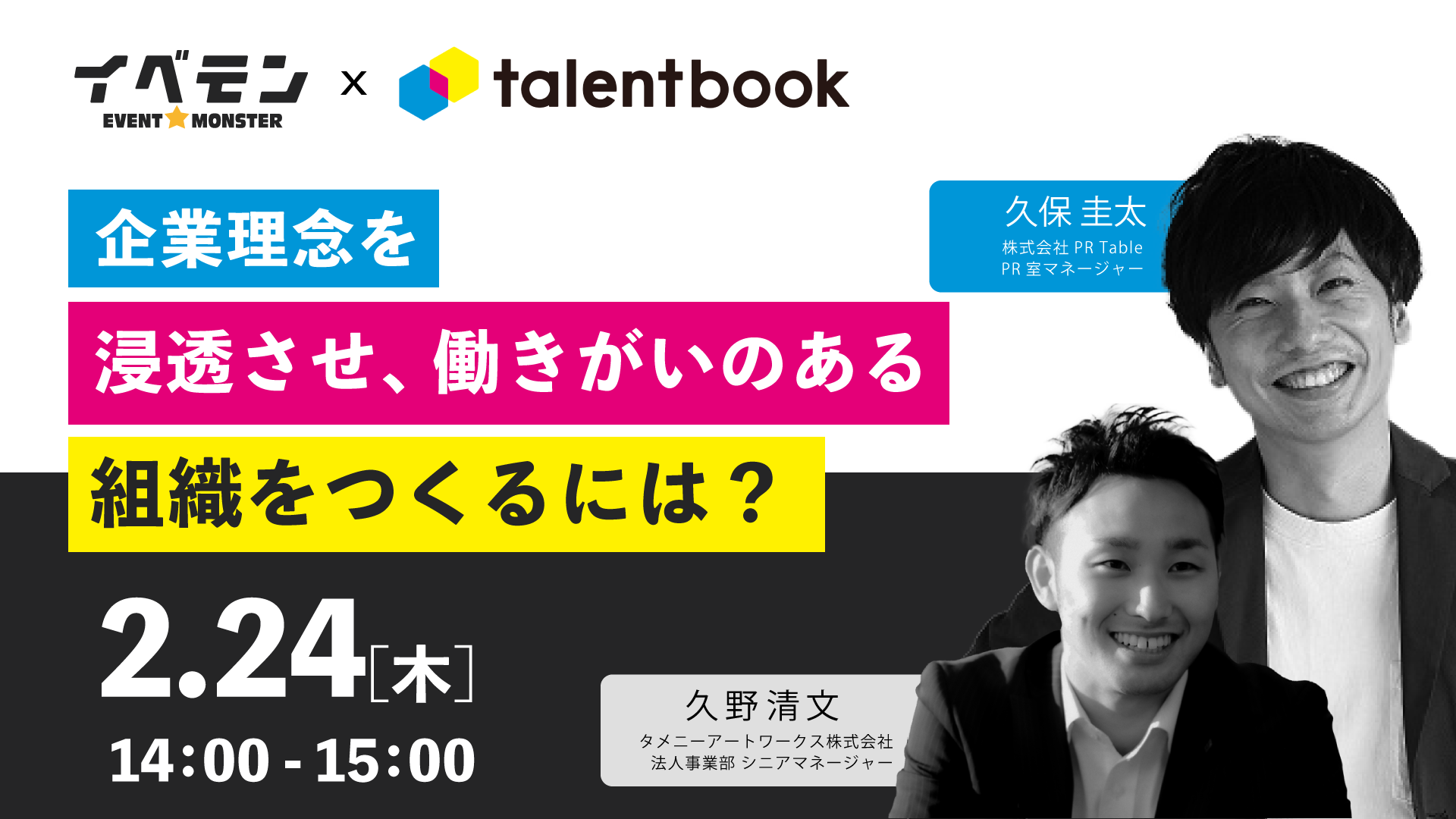 タメニー株式会社(本社:東京都品川区、代表取締役社長:佐藤茂、証券コード:東証マザーズ6181)のグループ会社であるタメニーアートワークス株式会社(代表取締役社長:福井秀幸)が運営する企業イベントプロデュース「イベモン(URL:https://evemon.jp/、以下「イベモン」)」は、株式会社PR Table(本社:東京都千代田区、代表者:大堀海、以下PR Table)と共同で、2月24日(木)、「企業理念を浸透させ、働きがいのある組織をつくるには?」をテーマとした無料ウェビナーを開催いたしますのでお知らせいたします。