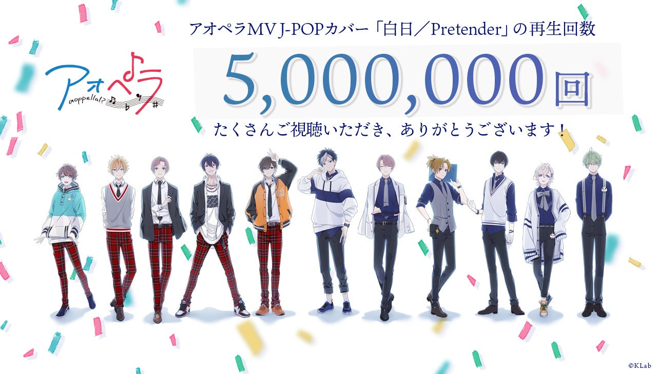 KLab株式会社(本社:東京都港区、代表取締役社長:森田英克、以下「KLab」)がおくる、「青春」×「アカペラ」がテーマの音楽原作プロジェクト『アオペラ -aoppella!?-』(以下、『アオペラ』)は、2022年3月15日(火)に、公式YouTubeチャンネルで公開中のJ-POPカバー「白日/Pretender」の動画再生回数が500万回を達成しました。