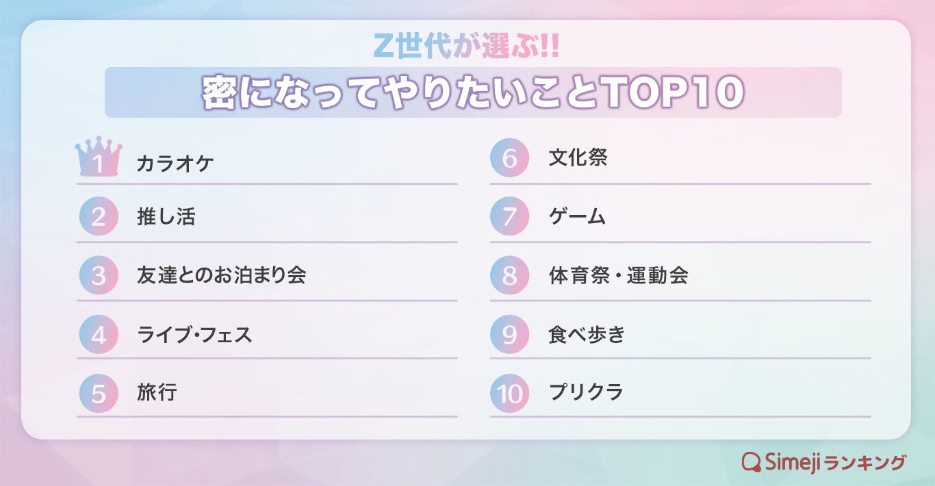 【Simejiランキング】Z世代が選ぶ!!「密になってやりたいことTOP10」