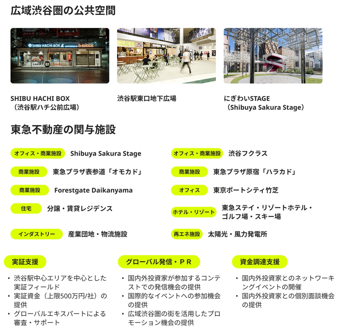 本プログラムは、世界が直面する環境課題の解決に挑む国内外の有望なグリーンテックスタートアップを6社程度採択し、広域渋谷圏での実証実験機会などを提供する取り組みです。実証フィールドとして、広域渋谷圏における公共空間や、東急不動産の多様なアセット(オフィスビル、商業施設、複合施設、ホテル、住宅等)を提供します。