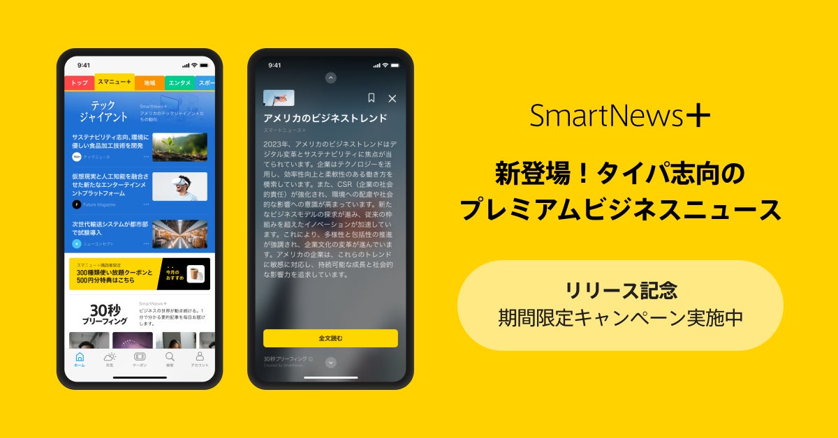 スマートニュース、有料ビジネスニュースとクーポンを集約した日本初の購読サービス『SmartNews+』を提供開始 国内外25以上のメディアの厳選記事が読み放題