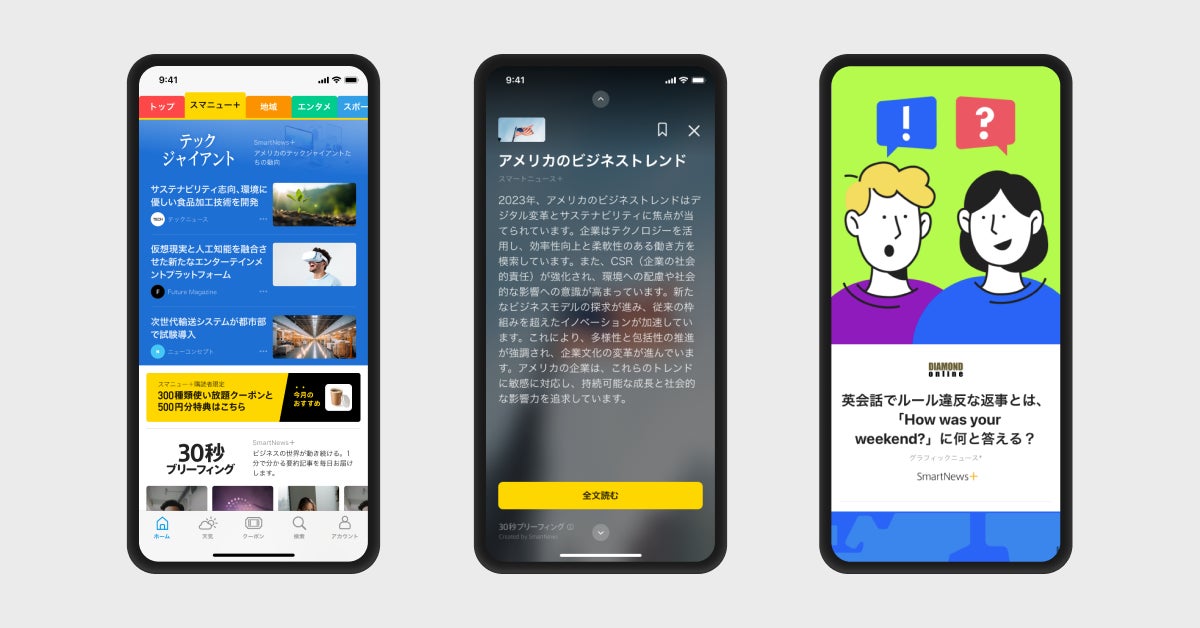(画像)左から「SmartNews+」トップ画面、「AIサマリー」、「グラフィックニュース」