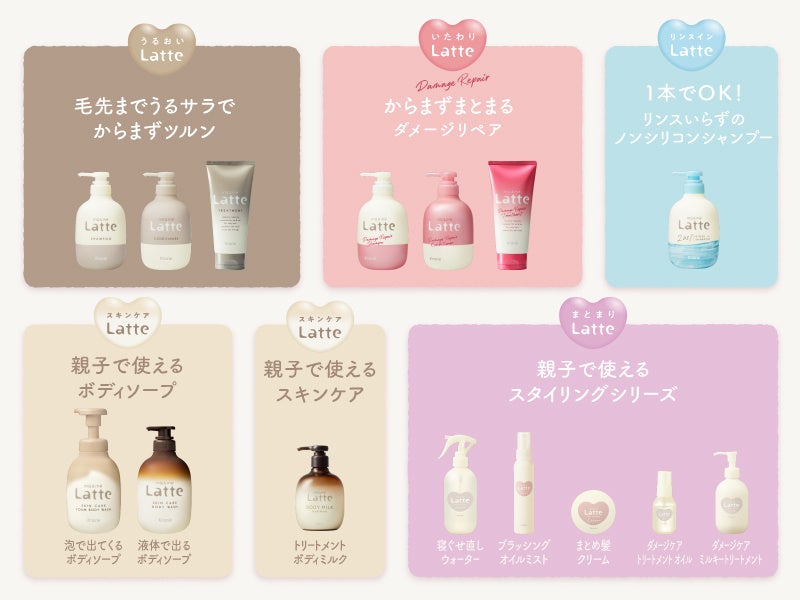 「マー&ミー ラッテ」は「わたしにも、こどもにも、うれしい。」をテーマに、親子で一緒に使えるヘアケア&スキンケア商品を展開しています。すべてのアイテムにブランド共通特長成分「プレミアムWミルクプロテイン」を配合し、おとなと子どもの異なるダメージを同時にケアします。