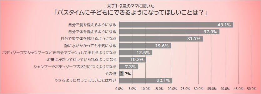 バスタイムに子どもに自分でできるようになってほしいこと第1位は「自分で髪を洗えるようになること」、第2位は「自分で体を洗えるようになること」、第3位は「自分で髪や体を拭けるようになること」でした。洗髪洗体からお風呂あがりのケアまで子どもが自分でできるようになってほしいと、多くのママが望んでいることが分かりました。