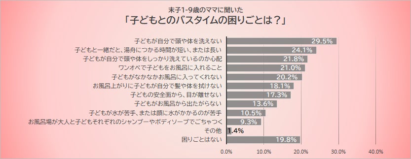 子どもとのバスタイムでの困りごとについて、1歳~9歳の子どもをもつママの第1位は「子どもが自分で頭や体を洗えないこと」、第2位は「子どもと一緒だと、湯舟につかる時間が短い、または長い」、第3位は「子どもが自分で頭や体をしっかり洗えているのか心配」でした。子どもに自分で洗えるようになってほしいママの想いと、洗えるようになり始めても、「しっかり洗えているのか」心配も尽きないという親心が垣間見えます。
