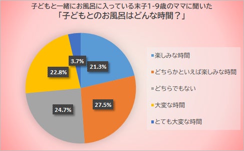 1歳~9歳の子どもをもつママに、子どもとのお風呂はどんな時間であるか調査したところ、「楽しみな時間」、「どちらかといえば楽しみな時間」と回答したママは48.8%で、約2人に1人のママは「子どもとのバスタイムは楽しみな時間」と捉えていることが分かりました。一方で、残りの約半数のママは「どちらでもない(24.7%)」、「大変な時間(22.8%)」、「とても大変な時間(3.7%)」との回答もあり、「子どもとのバスタイムに苦労している」ママもいらっしゃるようです。