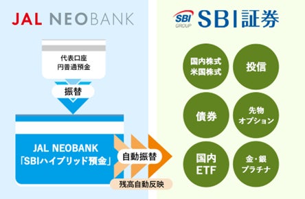2020年4月28日より開始した、JALと住信SBIネット銀行の合弁会社であるJALペイメント・ポート社と住信SBIネット銀行株式会社が提供する「JAL NEOBANK」にてSBIハイブリッド預金を新たに利用できるようになります。「JAL NEOBANK」の「SBIハイブリッド預金」へ預入れたお金は、お客さまのSBI証券口座の買付余力に自動的に反映され、株式や投資信託、債券などの取引に便利にご利用いただけます。また、証券取引に伴う精算代金は、受渡日にSBIハイブリッド預金とSBI証券口座との間で自動的に資金振替を行います。(預り金自動スィープサービス)