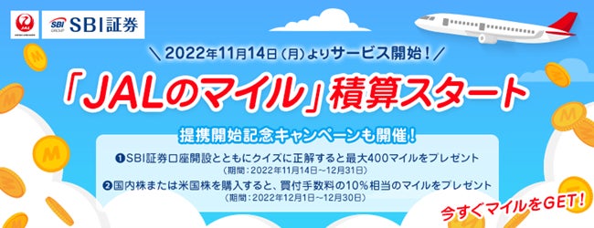 株式会社SBI証券(代表取締役社長:髙村正人、以下「当社」)は日本航空株式会社(代表取締役社長:赤坂祐二、以下「JAL」)と提携し、JALマイレージバンク会員向けに当社での取引額に応じて「JALのマイル」を積算するサービスを2022年11月14日(月)より開始することとなりましたので、お知らせします。