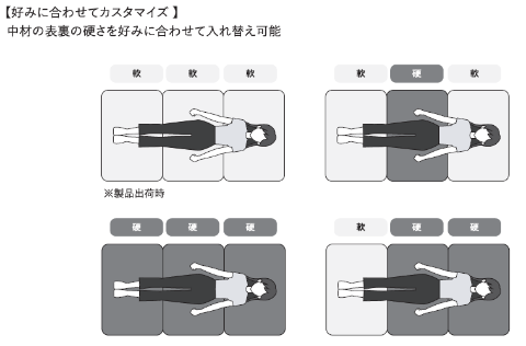 ・中材は優れた耐久性と、ワコール独自の三層構造で表裏の硬さを好みに合わせて入れ替え可能。(下図)