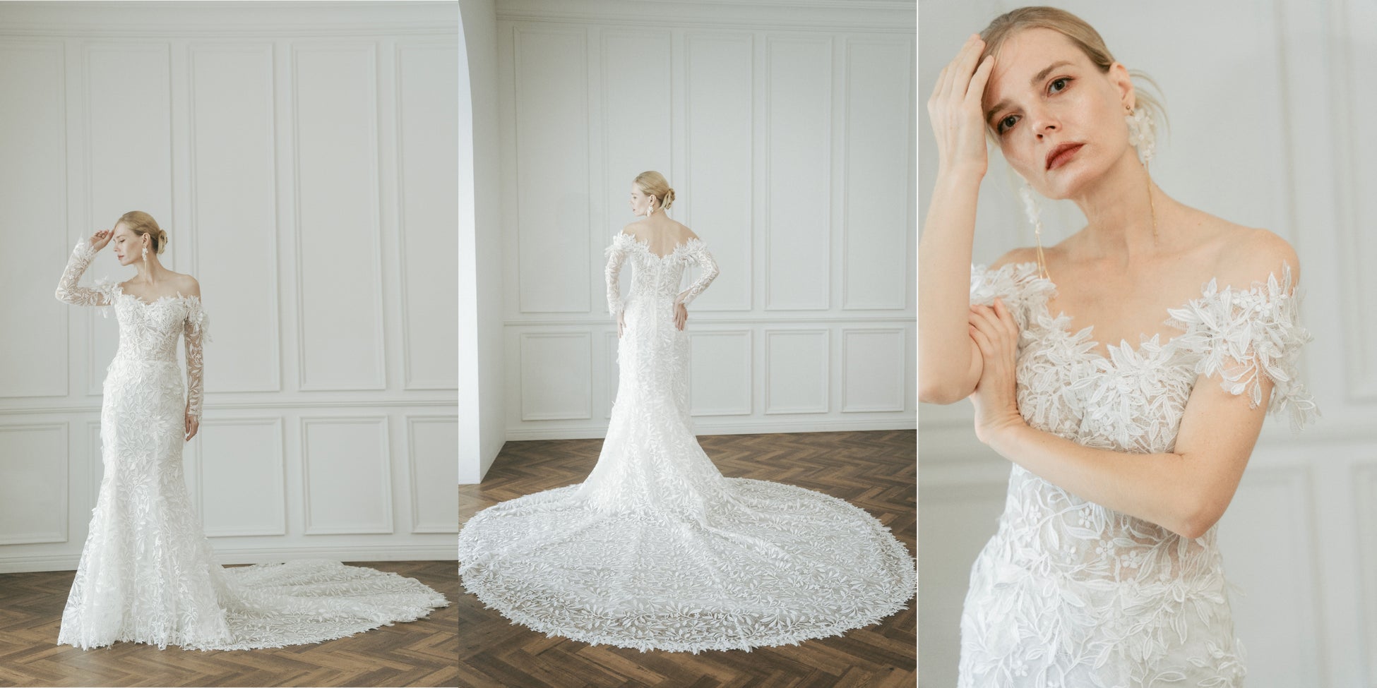 オフショルダーに繊細な立体刺繡を施し、女性らしく柔らかな雰囲気を演出します。ドレス全体に生命感を与える立体的な刺繍モチーフがボディラインをより美しく整え、オフショルダー部分に豊かにあしらわれた装飾が視線を惹きつけ、特別な魅力を与えます。