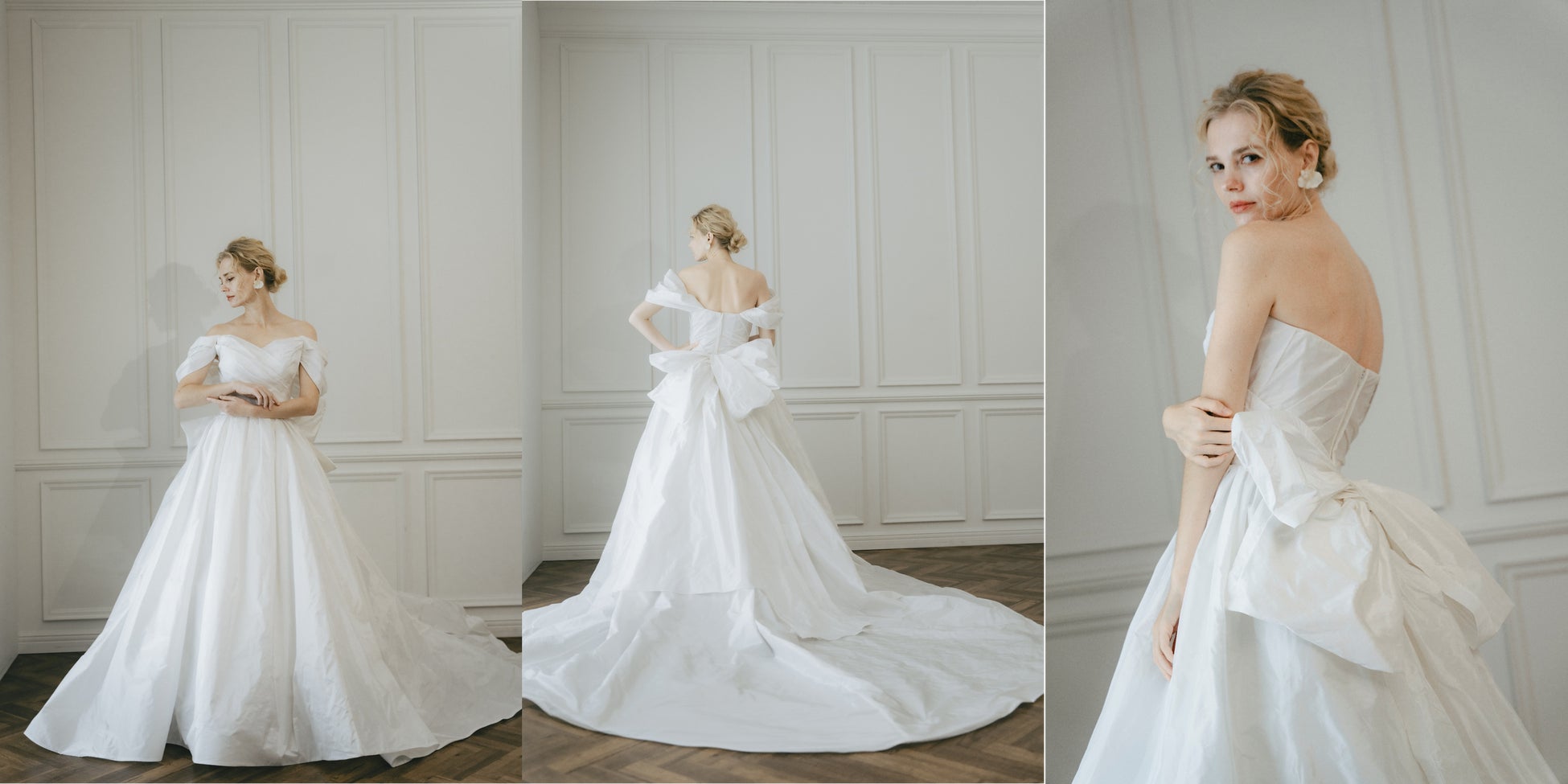 今回は、韓国でも特に人気の高いウェディングドレス4デザインにワタベウェディングのオリジナルアレンジを加えて登場いたします。「Seren(セレン)」はドレス全体にきらめくビーズとスパンコールがウエストラインから上半身、そして豊かなスカートへと花開くように広がり、華やかさを演出します。幾重にも重ねられた素材によるボリューム感あるスカート、シースルー素材の上見頃、繊細に刺繡された袖が幻想的なボディラインを描き出します。「Serenata(セレナータ)」はオフショルダーに繊細な立体刺繡を施し、女性らしく柔らかな雰囲気を演出します。ドレス全体に生命感を与える立体的な刺繍モチーフがボディラインをより美しく整え、オフショルダー部分に豊かにあしらわれた装飾が視線を惹きつけ、特別な魅力を与えます。「Rosee(ロゼ)」は、立体的なフラワーモチーフと豊かなスカートが特徴のドレスです。全体に施された花びらの装飾がロマンティックな雰囲気を漂わせ、華やかさで花嫁の美しさを際立たせます。「Clair(クレール)」は、上半身の立体的なドレーピングが目を引くデザインのドレスです。シンプルなシルエットと高級素材でエレガンスを極大化しています。肩を出すことで鎖骨や首筋を美しく強調したチューブトップネックラインは、クリーンかつ洗練された印象になります。