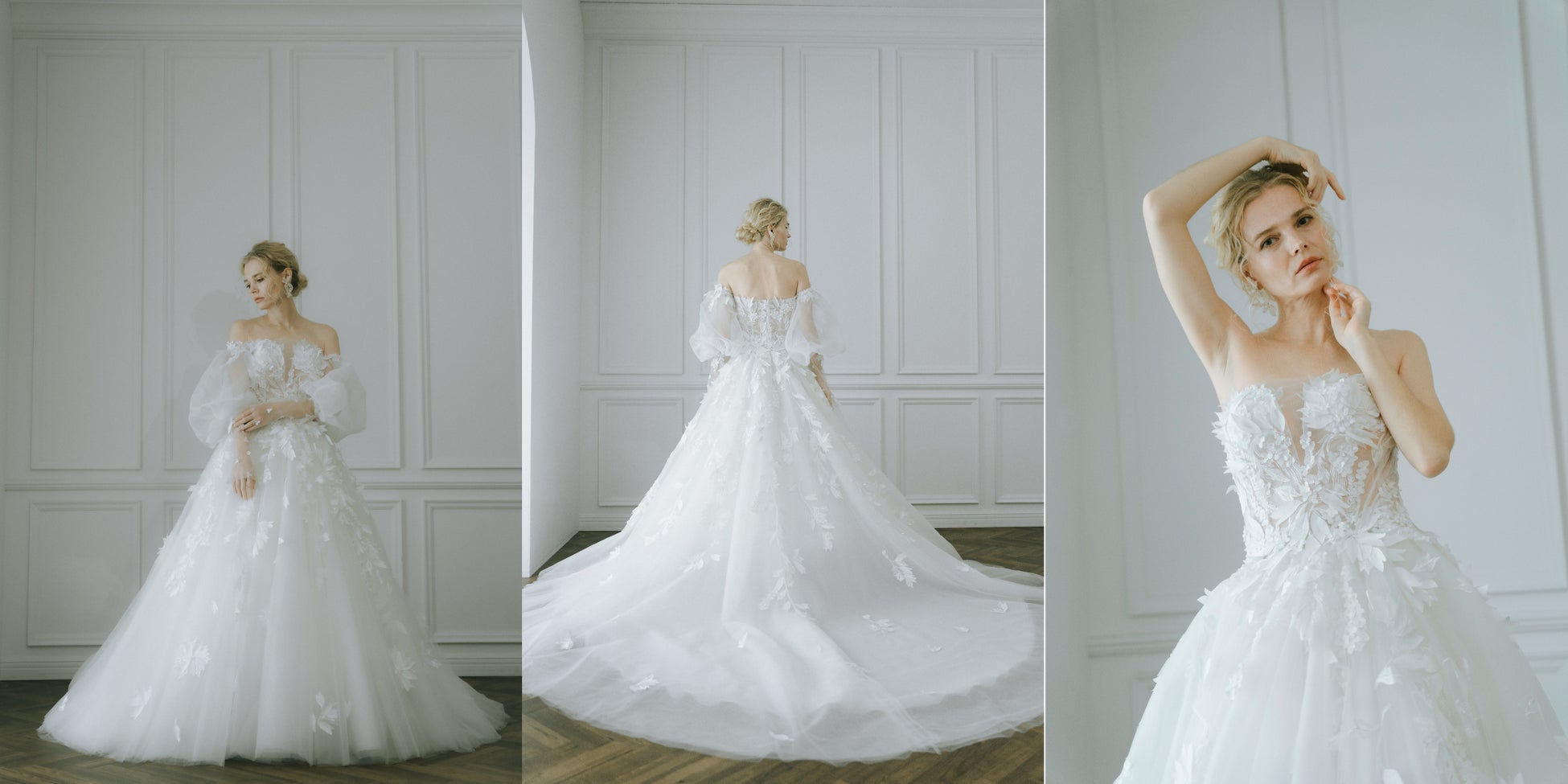 立体的なフラワーモチーフと豊かなスカートが特徴のドレス。全体に施された花びらの装飾がロマンティックな雰囲気を漂わせ、華やかさで花嫁の美しさを際立たせます。