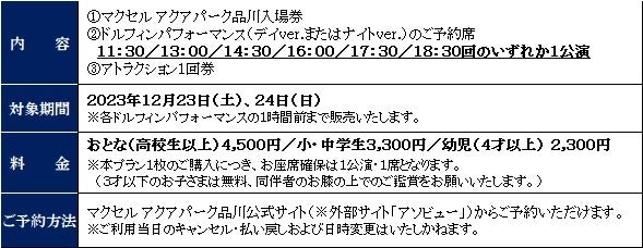 入場券と「ドルフィンパフォーマンス(デイver.またはナイトver.)」1公演分のお座席確約、アトラクション1回券が付いた2日間限定のプラン。
