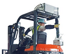 排熱レス&フロンレス スポットクーラー Pure Driveの技術を生かし、バッテリータイプのフォークリフト用に開発されたスポットクーラー。高い冷却性を保持しながら、小型化と低消費電力を実現した。ドライバーの快適性が確保できるだけでなく、作業場の空調設定を弱めることが可能となり、作業場全体の省エネにも貢献。また、低消費電力であることから、フォークリフトの稼働時間にもほとんど影響しない。