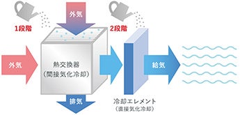 冷却エレメント内での水の気化現象「直接気化冷却」と、熱交換器内での水の気化現象「間接気化冷却」を組み合わせた、ブラザー独自の2段階冷却技術(下図参照)。この冷却技術により、コンプレッサーも冷媒も不要となり、排熱レスとフロンレス*2を実現。冷たい風だけを送ることができ、作業環境全体の快適性が向上するだけでなく、フロン類不使用であることから、環境負荷低減にも貢献する。