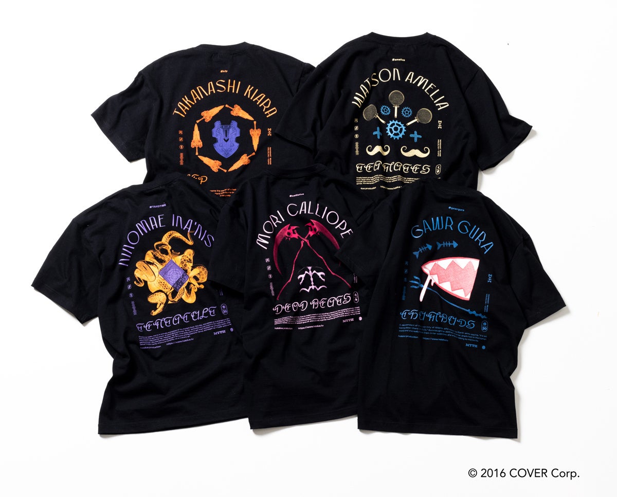 アイテムは、REALROCKDESIGN所属 グラフィックデザイナー・伊藤孝哉氏を起用し、『ホロライブ English -Myth-』のそれぞれのメンバーコンセプトと音楽フェスから着想を得たデザインとなっており、メンバーのモチーフとなるイラストで構成したTシャツに仕上がりました。
