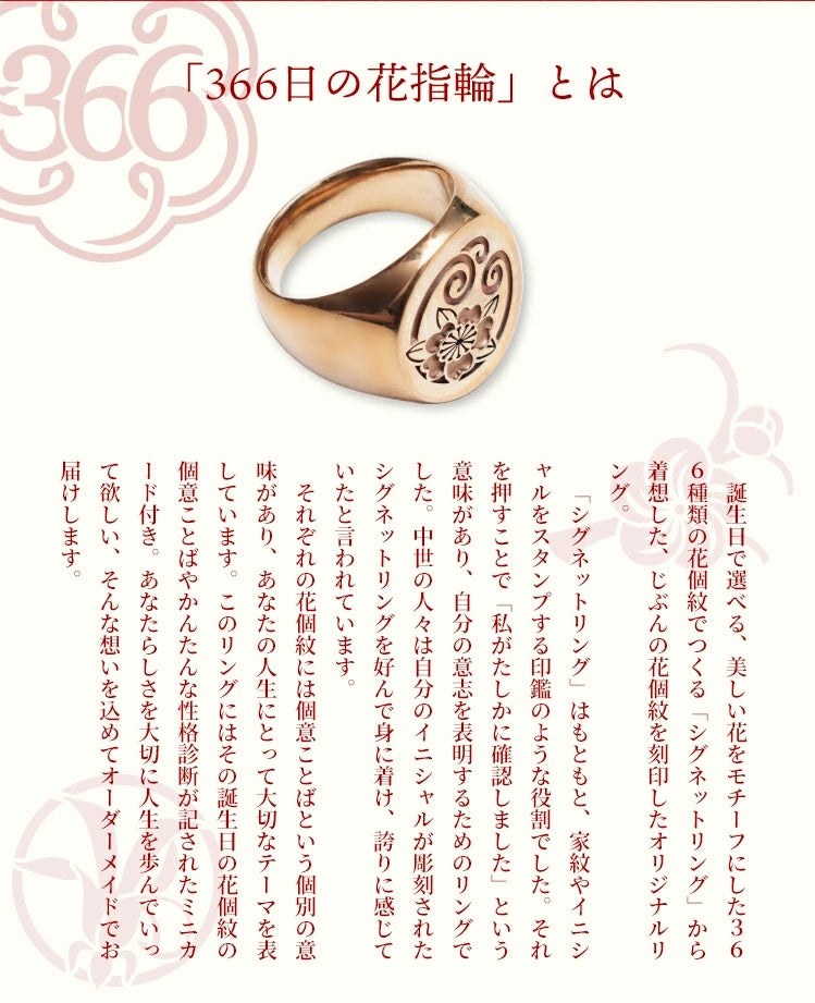 14世紀のイングランド国王エドワード2世が「すべての公式文書には、王の印章リングによる印がなければならない」と定めたことから必要不可欠なアイテムになったシグネットリングを現代風にアレンジした「366日の花指輪」。
