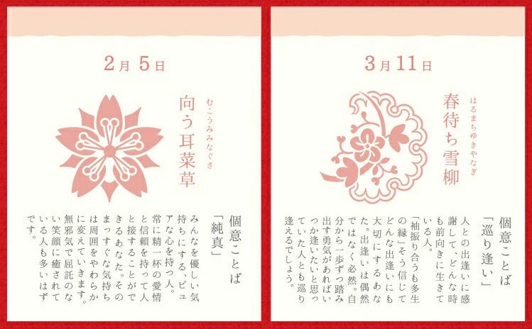 366日(365日+うるう年の2月29日)それぞれの花個紋には、「純真」「巡り逢い」といった個別の意味(個意ことば)があり、以下の専用WEBサイトでは誕生日を入れるだけで自分の花個紋や個意ことばが見れるほか、簡単な性格診断が無料で楽しめます。