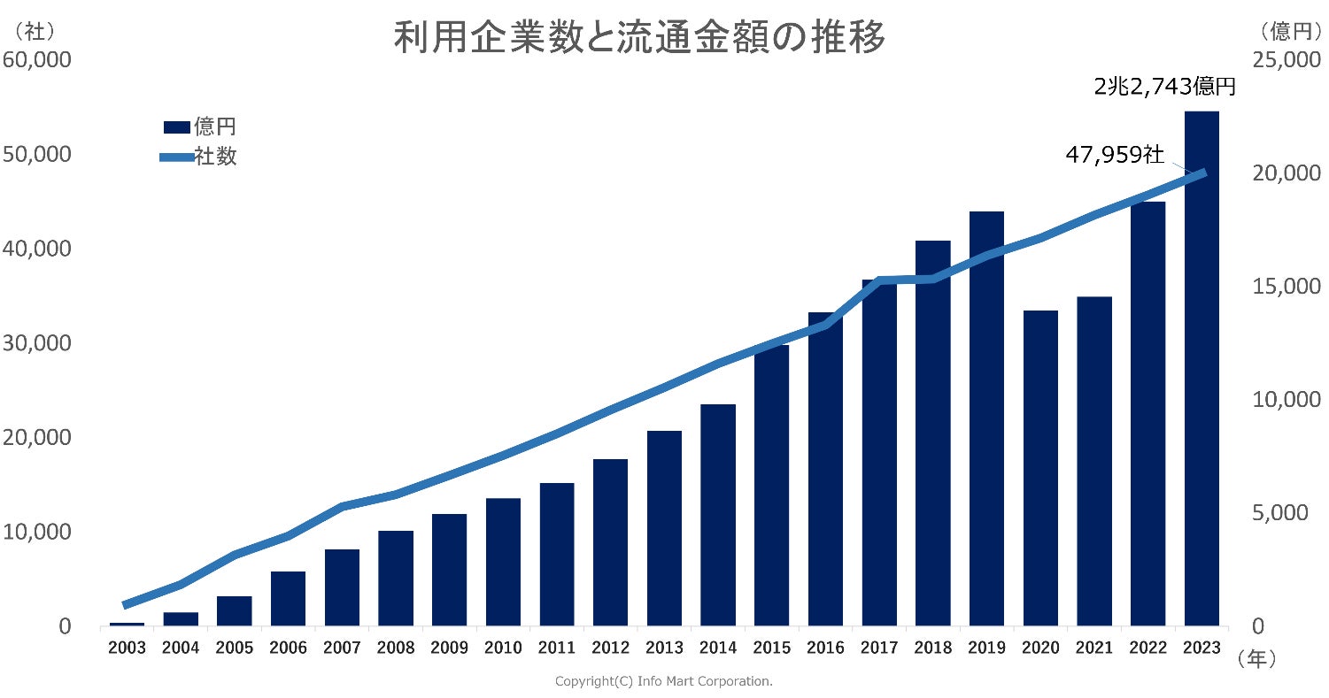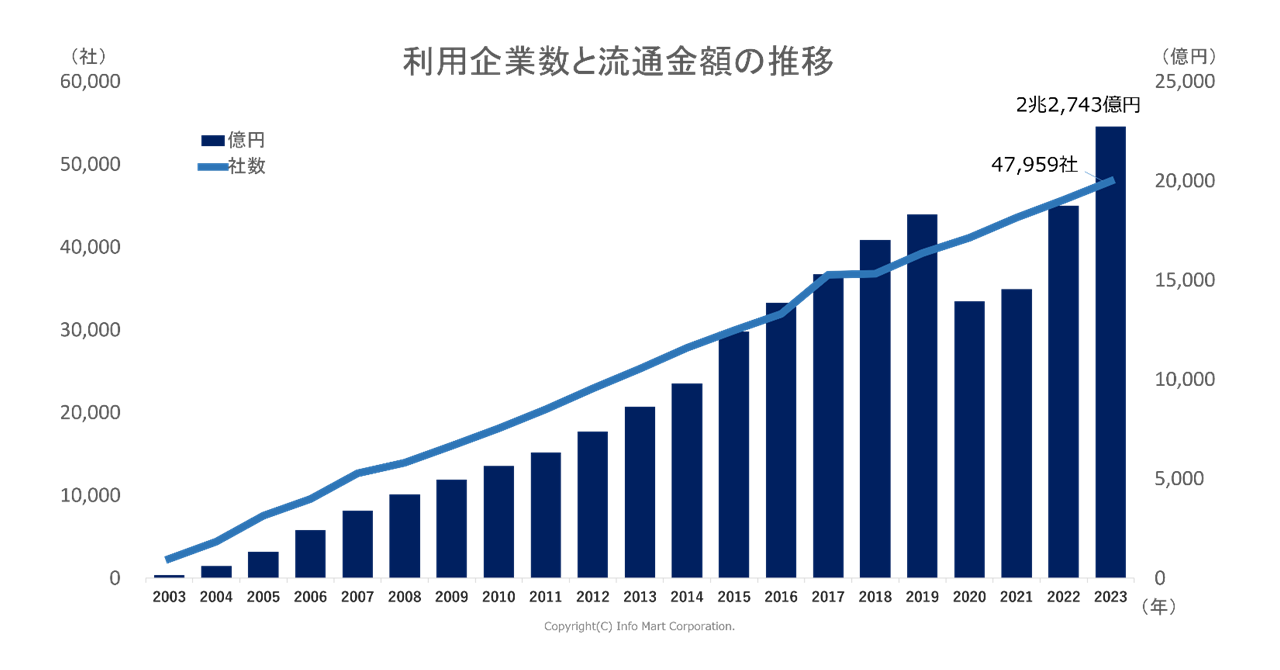 2003年にサービスの提供を開始してから、利用企業数は堅調に拡大してきました。流通金額は2020年のパンデミックで減少しましたが、徐々に回復し、2023年はコロナ禍以前の2019年を上回る2兆2,743億円となり、外食産業市場におけるシェア率は34.6%(※)となりました。