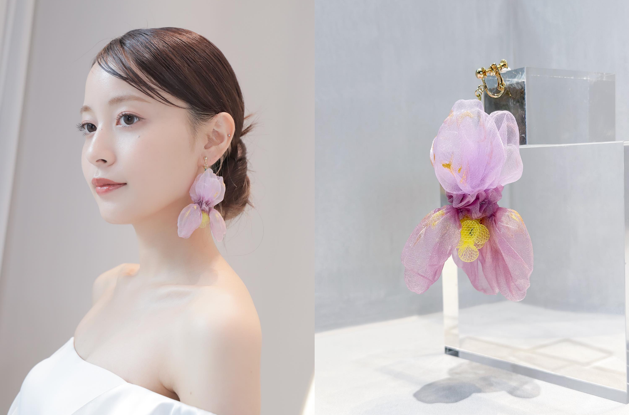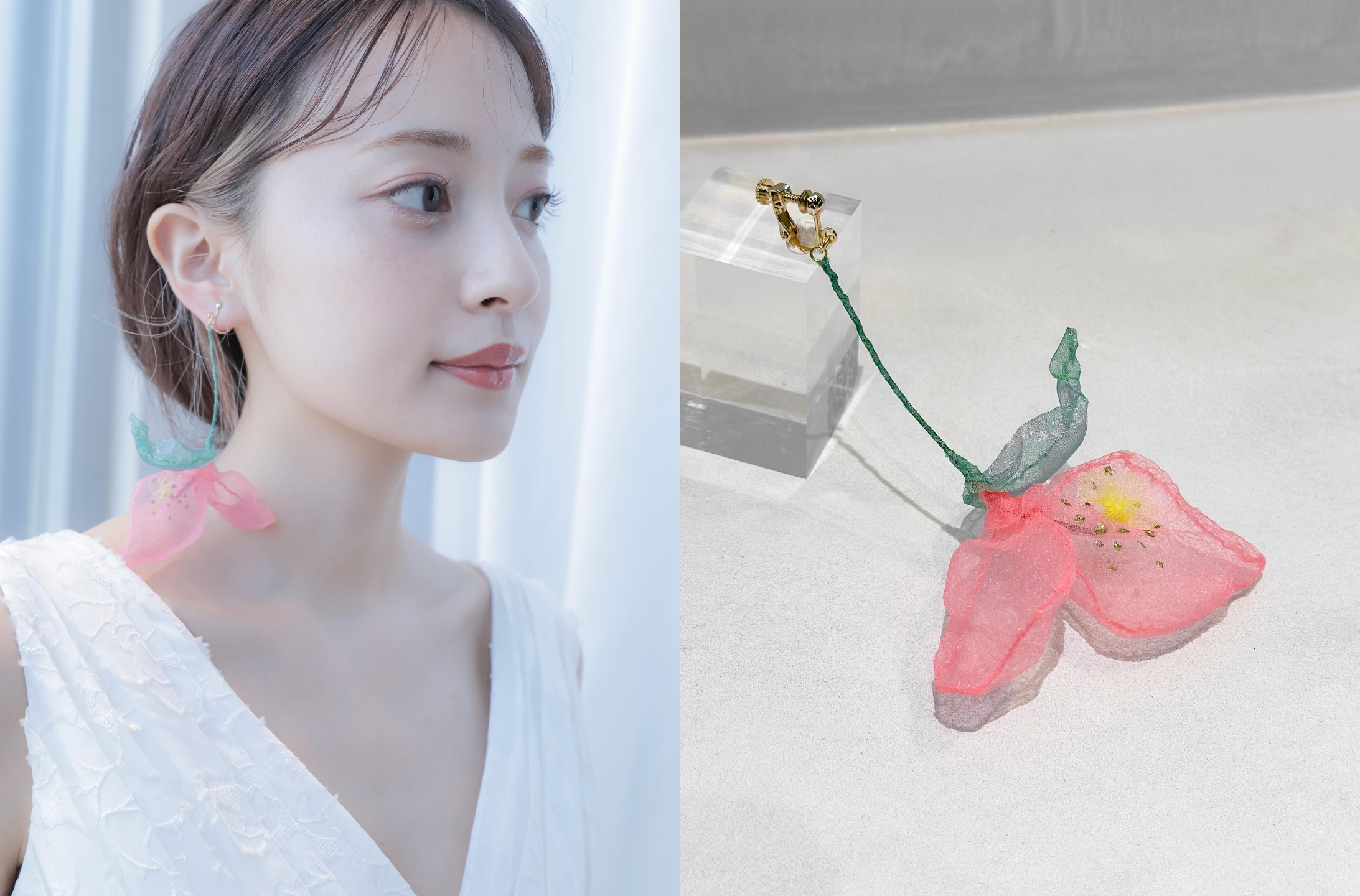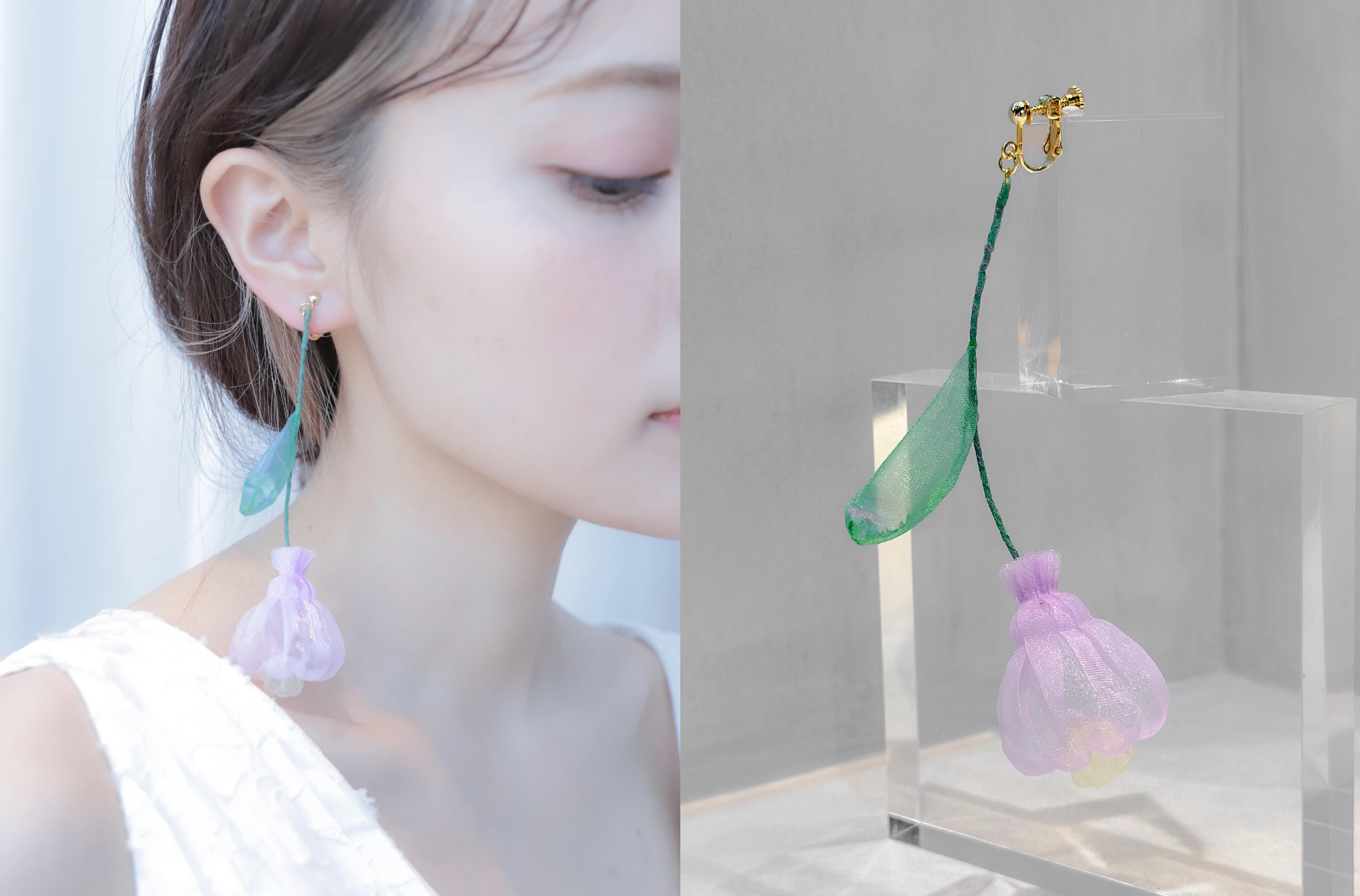 一輪挿しのような繊細さと上品さのあるイヤーアクセサリー。シンビジウムやフクシアなど、恋の花を彷彿とさせるモチーフが魅力。